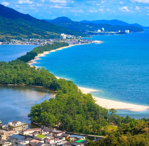 Tiếp theo, hành trình sẽ đưa bạn đến Amanohashidate, một trong “Ba cảnh đẹp nhất Nhật Bản”. Hãy lên đài quan sát để chiêm ngưỡng dải cát trắng xóa phủ đầy thông xanh, vươn mình chia cắt vịnh Miyazu như một cây cầu huyền ảo bắc lên thiên đường – một tuyệt tác của tạo hóa.